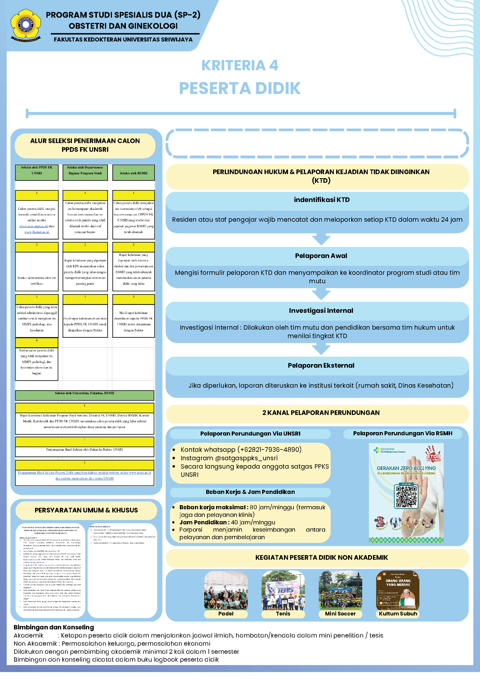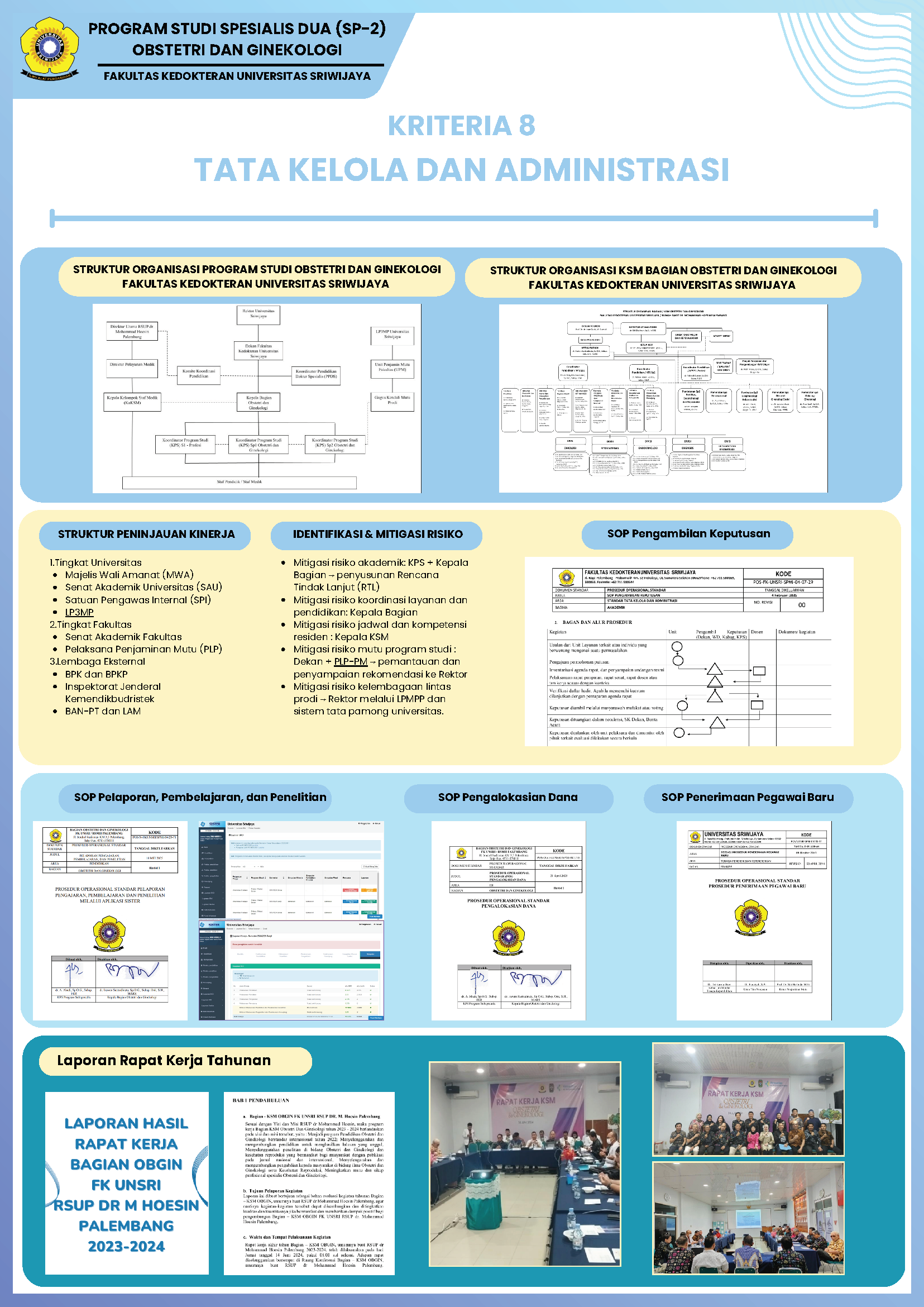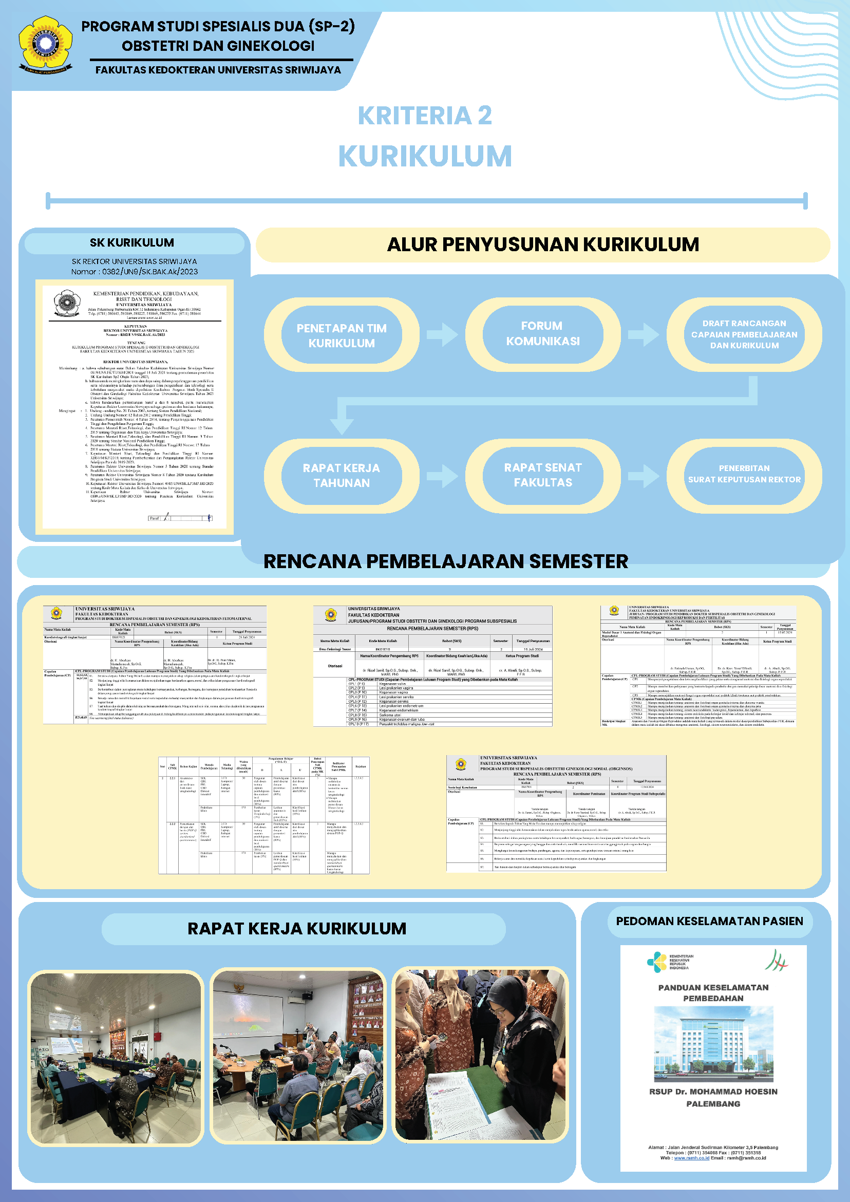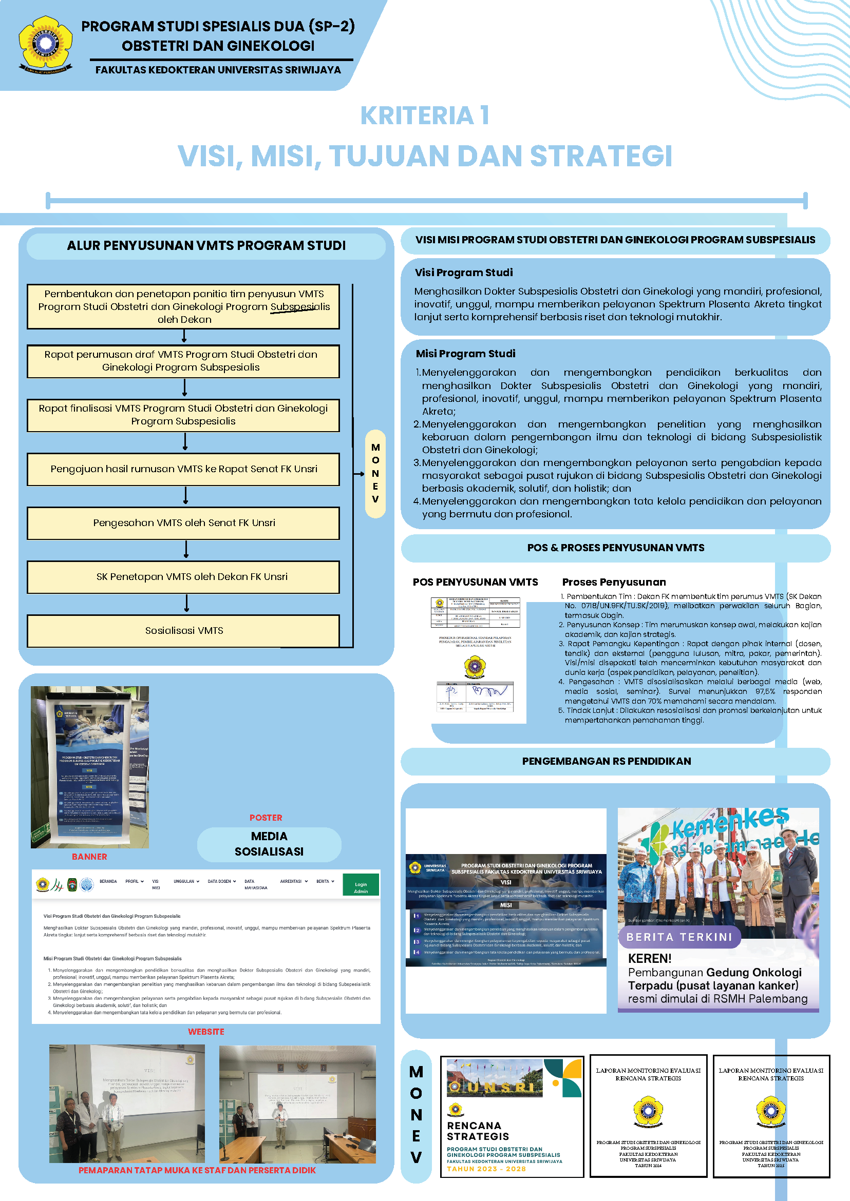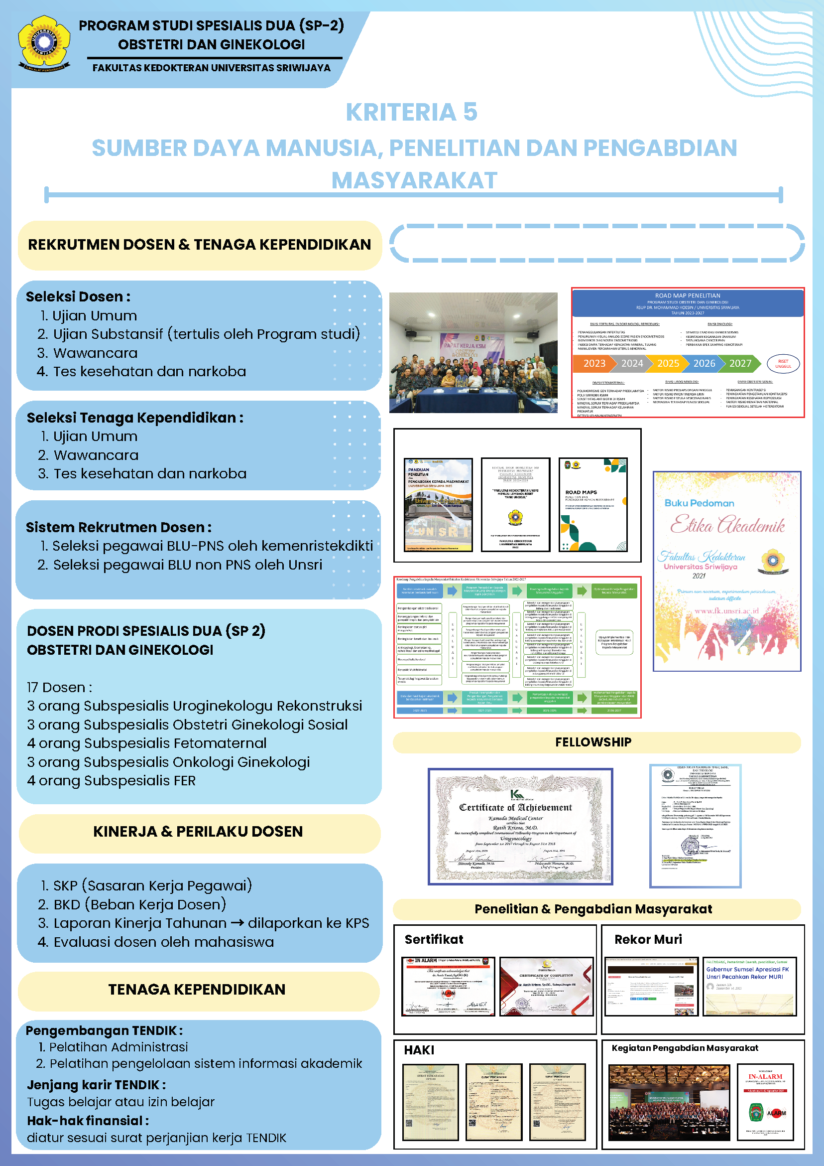 Program Studi Obstetri dan Ginekologi Program Subspesialis Fakultas Kedokteran Universitas Sriwijaya merupakan program pendidikan yang didirikan untuk memenuhi kebutuhan nasional akan subspesialis obstetri dan ginekologi yang kompeten, profesional, dan mampu beradaptasi dengan perkembangan ilmu pengetahuan, teknologi, serta kebutuhan masyarakat. Program Studi Obstetri dan Ginekologi Program Subspesialis Fakultas Kedokteran Universitas Sriwijaya diselenggarakan berdasarkan Keputusan Menteri Pendidikan, Kebudayaan, Riset, dan Teknologi No. 566/E/O/2023 tanggal 10 Juli 2023 tentang Izin Pembukaan Program Studi Obstetri dan Ginekologi Program Subspesialis di Universitas Sriwijaya. Program Studi Obstetri dan Ginekologi Program Subspesialis Fakultas Kedokteran Universitas Sriwijaya memiliki kurikulum yang disusun berdasarkan standar nasional, mengacu pada Peraturan Konsil Kedokteran Indonesia (KKI) Nomor 87 Tahun 2020 tentang Standar Pendidikan Profesi Dokter Subspesialis Obstetri dan Ginekologi. Program studi ini mencakup lima peminatan, yaitu: Fertilitas Endokrinologi Reproduksi, Kedokteran Fetomaternal, Onkologi Ginekologi, Obstetri dan Ginekologi Sosial, dan Uroginekologi Rekonstruksi. Lulusan pada program studi ini meraih gelar Subspesialis yang disesuaikan dengan peminatannya.